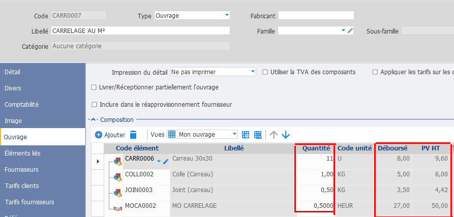 •de modifier le déboursé et prix de vente de vos composants