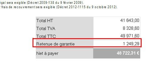 La retenue de garantie est un pourcentage du montant du marché qui sera réglée par le client après l'achèvement des travaux.
